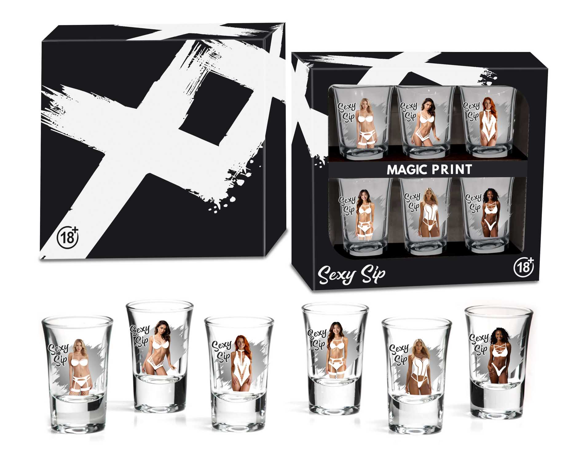 Фантастичний набір із шести скляних чарок для спиртних напоїв. На кожній чарці зображена приваблива жінка зі звабливими формами у одязі, який зникає при ...