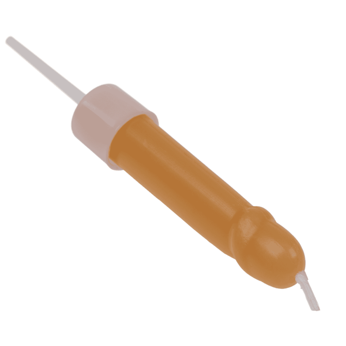 Червона м'яка губка для ванни у формі статевого члена з окресленою головкою, стовбуром та мошонкою. ...