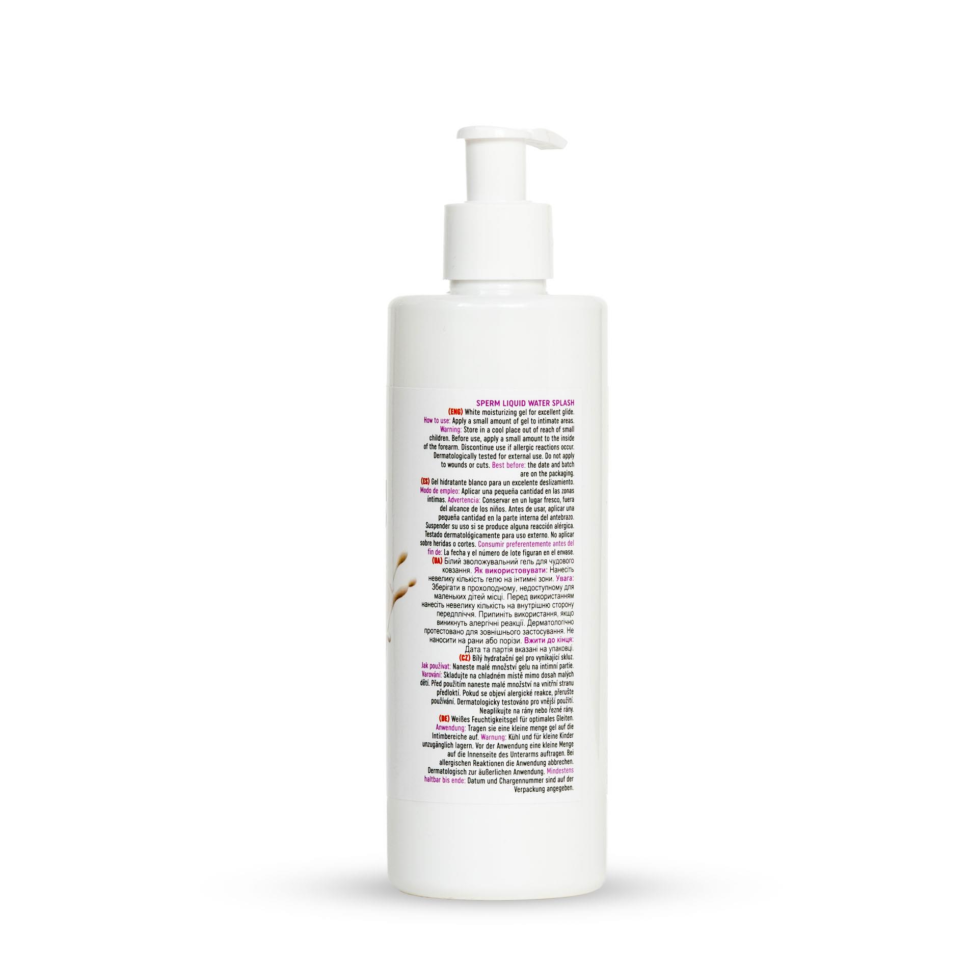 MyLove Sperm Liquid Water Splash — лубрикант на водній основі білого кольору, що імітує сперму, додаючи пікантності будь-якій ситуації. Гель має збалансовану густоту, легко розподіляється по шкірі, не липне і забезпечує тривале та стабільне ковзання.